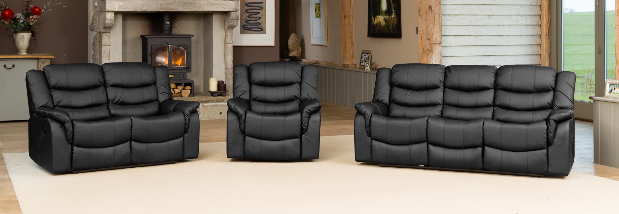 The upper parts of the sofa and the recliner are made of bonded leather, which is both durable and supple. The sides and back are PU. so the sofa combines a great finish with a high degree of practicality. The armchair and both seats of the 2 seater sofa recline, on the 3 seater sofa the left and right hand seats recline. There are two set recline positions, although the recliner can also be used in variable positions between them.