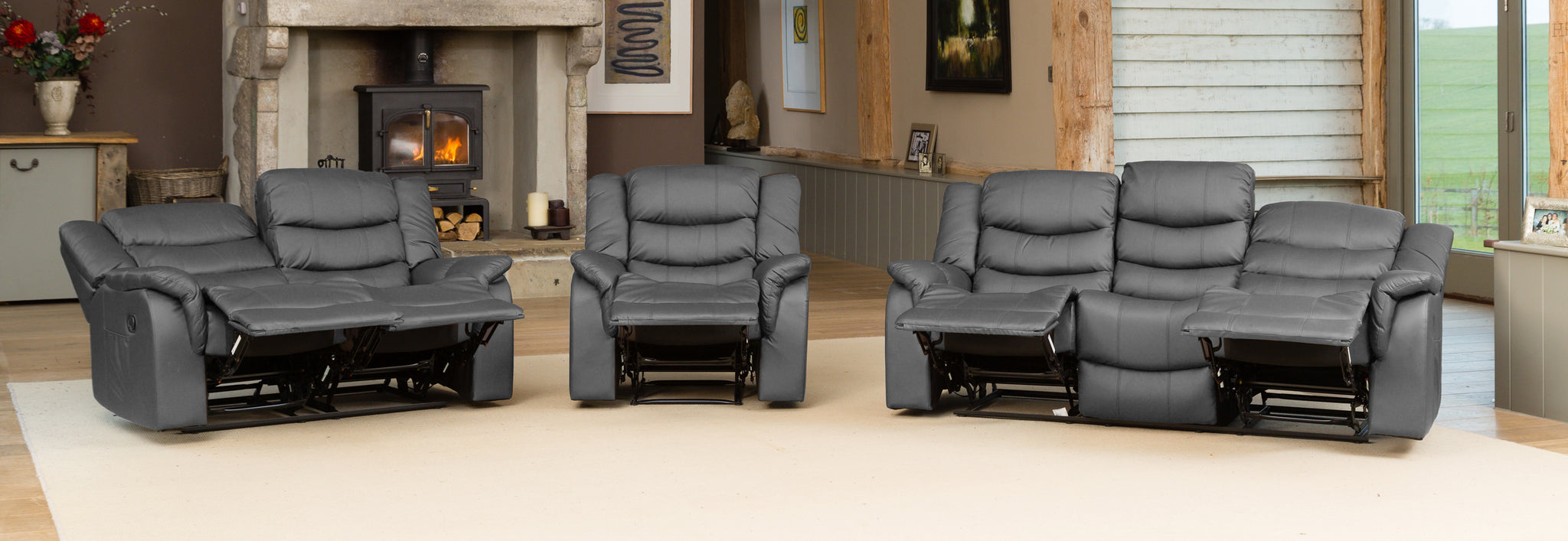 The upper parts of the sofa and the recliner are made of bonded leather, which is both durable and supple. The sides and back are PU. so the sofa combines a great finish with a high degree of practicality. The armchair and both seats of the 2 seater sofa recline, on the 3 seater sofa the left and right hand seats recline. There are two set recline positions, although the recliner can also be used in variable positions between them.