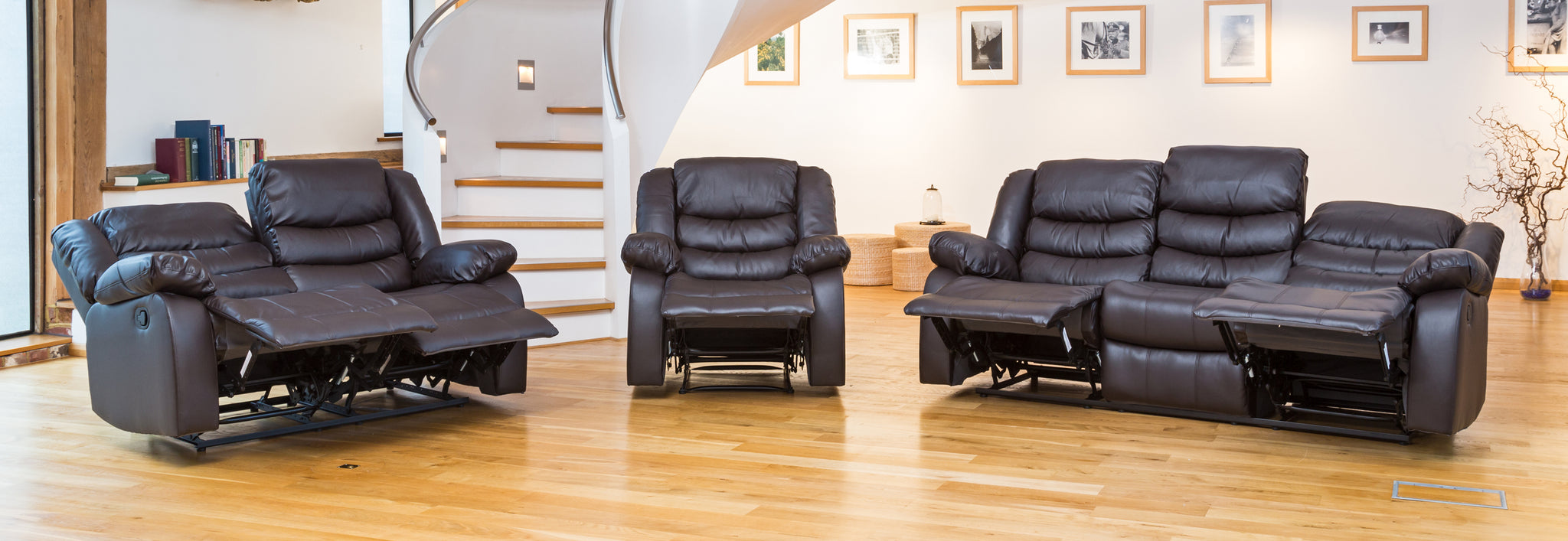 The upper parts of the sofa and the recliner are made of soft bonded leather, which is both durable and supple. The sides and back are leather match, so the sofa combines a great finish with a high degree of practicality. The armchair and both seats of the 2 seater sofa recline, on the 3 seater sofa the left and right hand seats recline. There are two set recline positions, although the recliner can also be used in variable positions between them. All fillings are fully fire retardant and meet or exceed UK safety regulations.